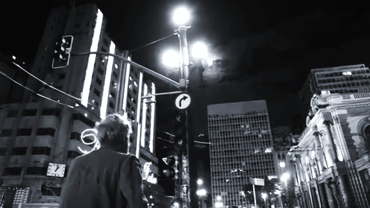 Acompanhamos durante todo o filme os deslocamentos do personagem de Bernardet pela região central da cidade de São Paulo. Ele é um intelectual e ex-professor que abandona tudo para viver na rua, apenas empurrando um carrinho de supermercado com poucos pertences, se deslocando anônimo por uma cidade enorme, que se faz sentir gigantesca e desordenada por meio das imagens de Burlan. Uma cidade personagem, um espaço de prolongamento existencial do protagonista. Ruas, praças, becos, esquinas, avenidas, túneis e pontes que o acolhem e o oprimem. A solidão do personagem só não é completa porque a força orgânica da cidade lhe serve de companhia. Burlan não busca o naturalismo nas cenas, tanto personagens como ambientes são retratados pela subjetividade do protagonista e suas pulsões internas. Isso ganha força pela escolha do preto e branco. A poesia visual que Burlan tira das imagens por meio da paleta em branco e preto na fotografia são uma forma de desconstruir a aspereza inerente aos espaços por onde seu personagem circula, conferem uma beleza reflexiva aos ambientes por onde ele anda e destacam o interior do personagem e seus conflitos existenciais em meio ao fluxo violento da cidade.